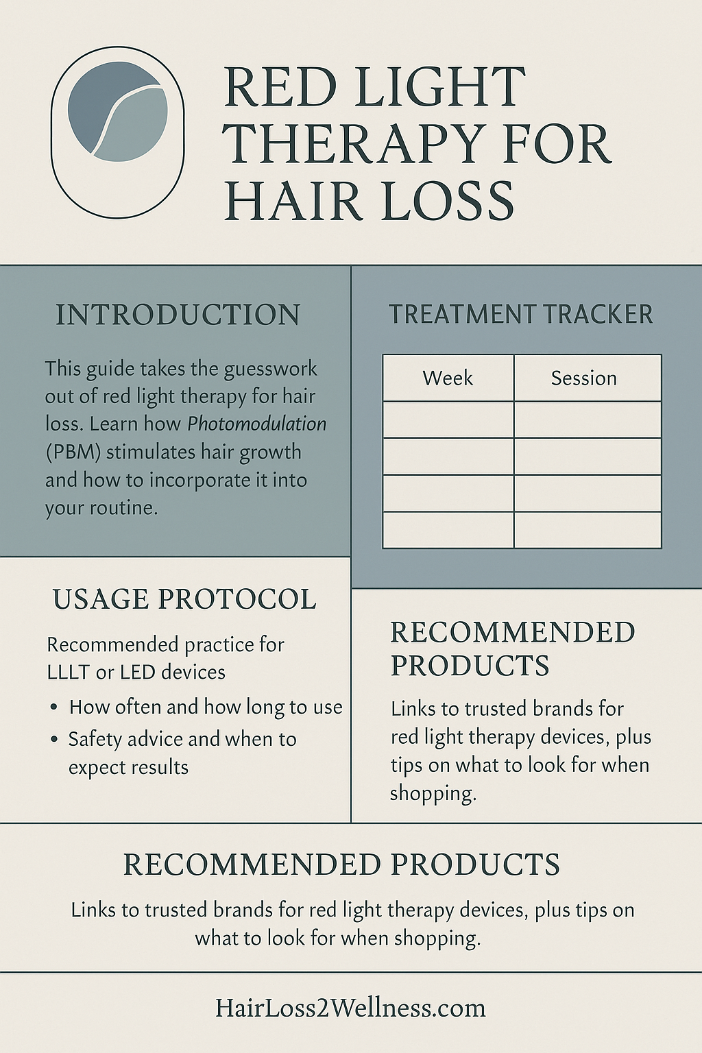 This guide takes the guesswork out of red light therapy. You’ll learn how low-level laser therapy (LLLT) works to stimulate hair follicles, what wavelengths matter most, and which devices are safe and effective. Includes links to trusted brands, a usage schedule, and protocols tailored to scalp application—whether you’re using a cap, wand, or panel.